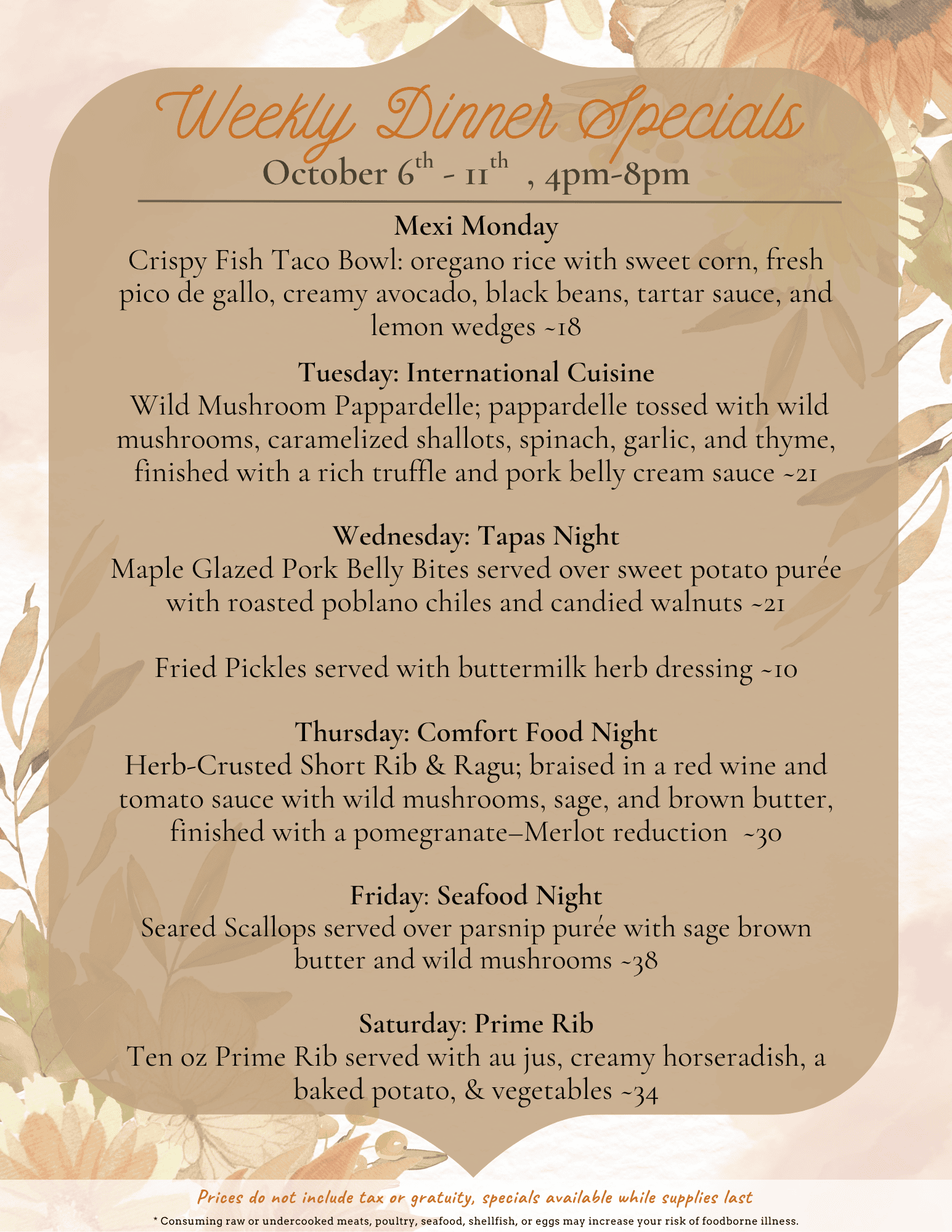 Dinner Specials - 10/6 to 10/11