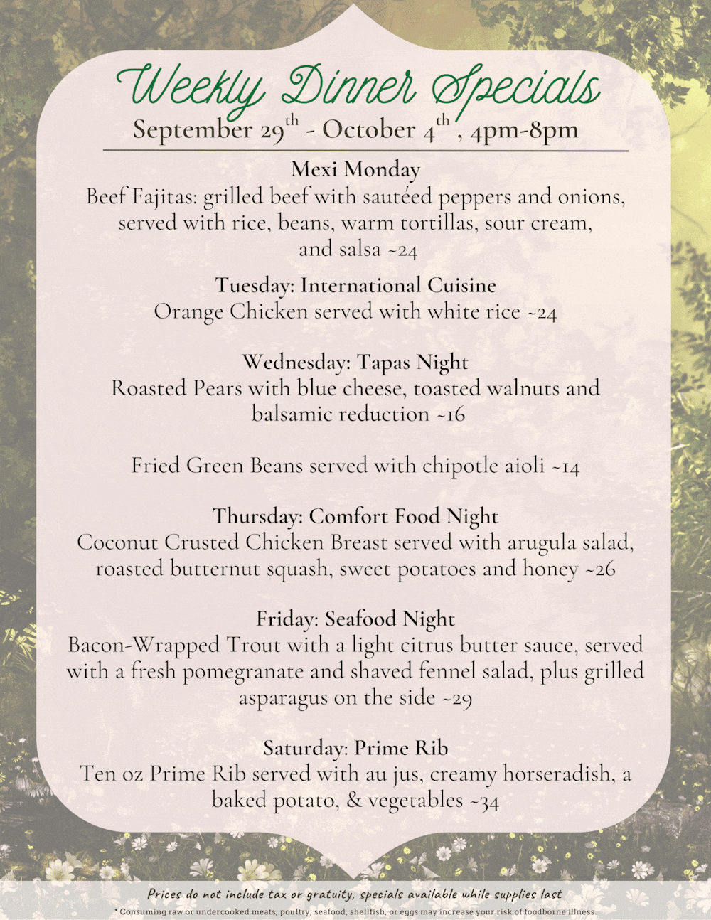 Dinner Specials - 9/29 to 10/4