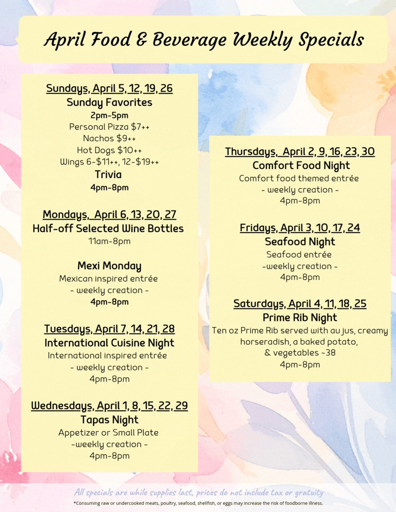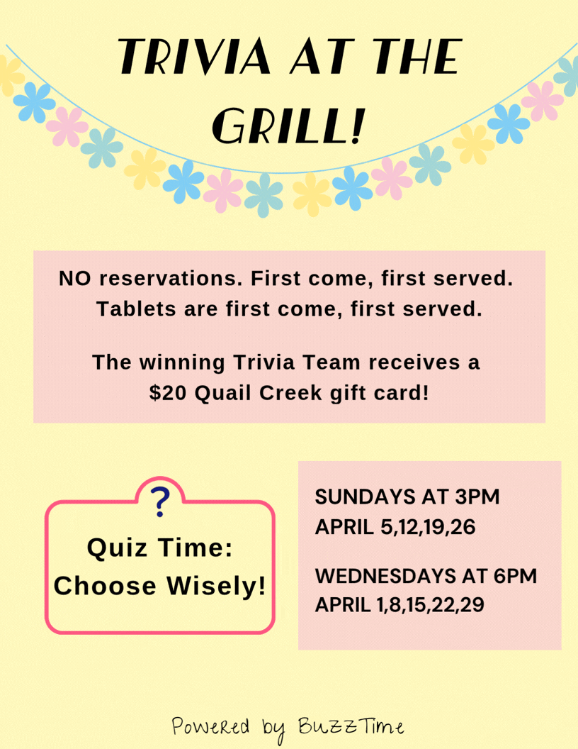 The Grill at Quail Creek is truly a delightful centerpiece, a gathering place where neighbors come to catch up on conversation or plan that next big adventure. You’ll enjoy the indoor & outdoor dining areas, a boardroom with a fireplace for private parties, and a U-shaped bar for enjoying happy hours with friends.